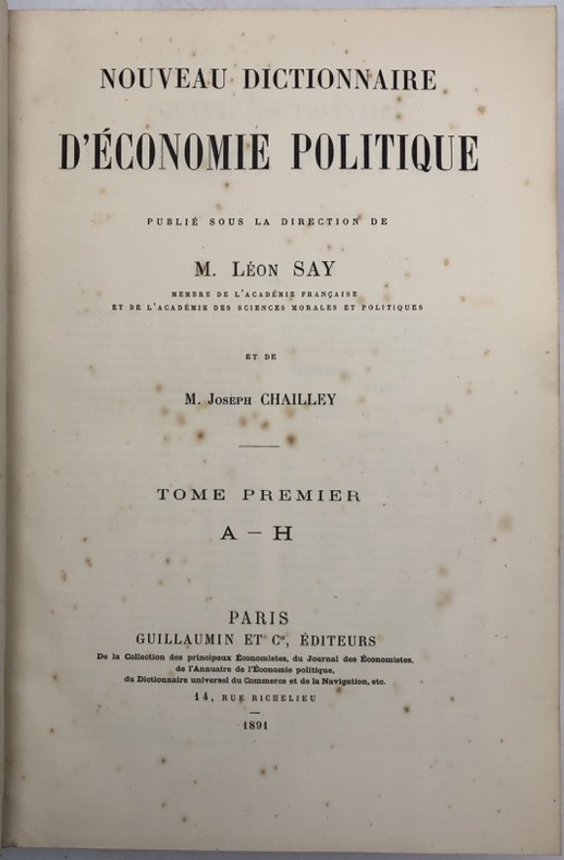 Édition originale de cet ouvrage qui était conçu pour remplacer le Dictionnaire de Coquelin et Guillaumin (1852). Sans les trois tables qui complètent certains exemplaires et portent la pagination du volume II à 1345. - - VENTE PAR CORRESPONDANCE UNIQUEMENT