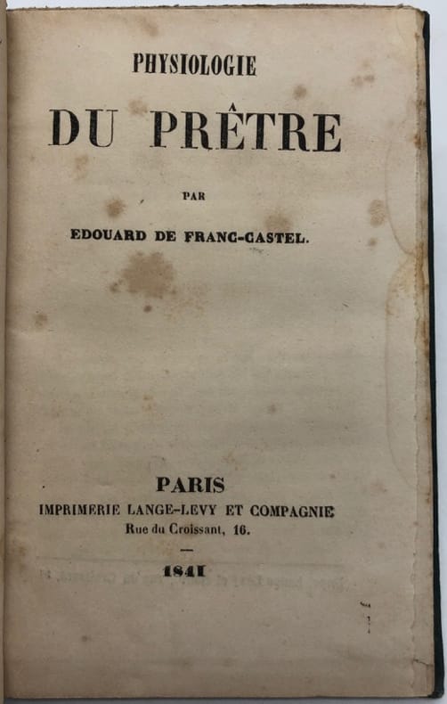 Unique édition de l'une des Physiologies les moins communes, curieusement peu agressive contre le clergé (on est pourtant en pleine Monarchie de Juillet), mais usant d'un ton persifleur et désabusé, qui devait paraître "so chic" dans les salons parisiens.Franc-Castel ressemble furieusement à un pseudonyme.L'Héritier, 90. - - VENTE PAR CORRESPONDANCE UNIQUEMENT