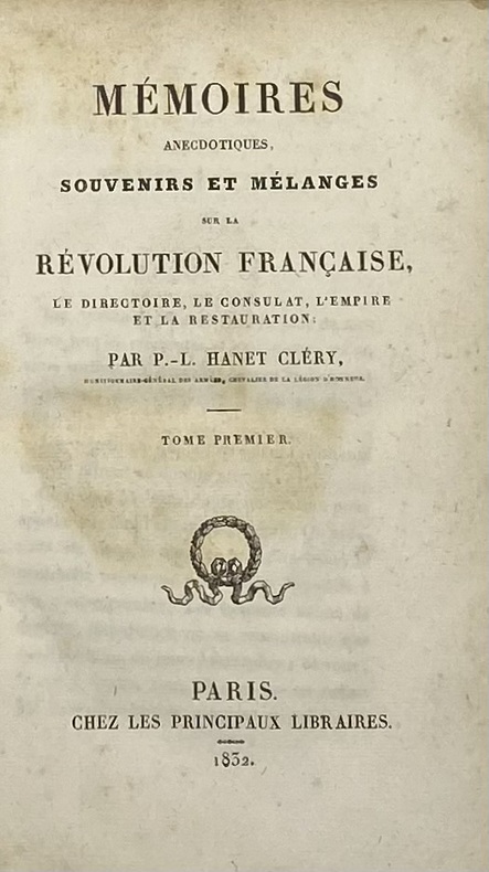 1825 Paris, A la Librairie d'Alexis Eymery, 1825. Deux volumes in-8 (134 X 208) demi-veau havane, dos lisse orné de filets dorés en place des nerfs, titre et tomaison dorés, fleuron doré dans les compartiments, tranches jaunes (reliure de l'époque) ; TOME I : VIII (dont faux-titre, titre et avant-propos), 2 planches hors-texte (portraits lithographiés des deux frères Cléry), 340 pages ; TOME II : faux-titre, titre, 351 pages.