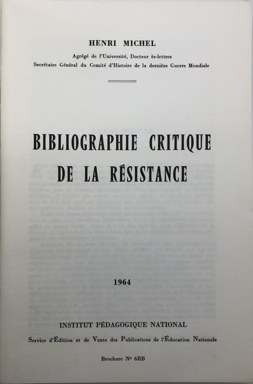 "Thèse annexe d'Henri Michel, secrétaire général du Comité d'histoire de la deuxième guerre mondiale. La thèse annexe est exactement complémentaire de la principale (“Les courants de pensée de la Résistance française”), puisqu'elle développe, explique et critique la bibliographie indicative de celle-ci. Elle apportera une bonne initiation au problème des sources de l'histoire de la résistance." (Olga Wormser, Annales ESC, 1965)