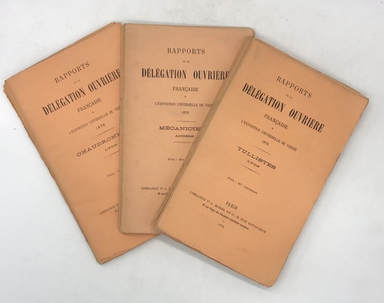Très intéressante collection qui réunit une grande partie des rapports spécialisés de la délégation ouvrière française à l'Exposition universelle de Vienne (1er mai - 31 octobre 1873). I. Architectes. Mécaniciens. Tapissiers. Nancy : 32 pp. [seul fascicule paru pour Nancy]. - II. Bijoutiers. Lyon : 19 pp., un f. n. ch. d'errata. - III. Bijoutiers (imitation) & boutonniers. Lyon : 11 pp., un f. n. ch. d'errata. - IV. Bronziers. Lyon : 27 pp. - V. Chapeliers. Lyon : 4 pp. - VI. Chaudronniers. Lyon : 44 pp. - VII. Cordonniers. Lyon : 16 pp. - VIII. Fondeurs. Lyon : 14 pp. - IX. Guimpiers. Lyon : 51 pp. - X. Mécaniciens. Angers : 17 pp. [seul fascicule paru pour Angers]. - XI. Mécaniciens. Voitures. Métiers d'art & d'utilité. Angoulême : 45 pp. [seul fascicule paru pour Angoulême]. - XII. Mécaniciens. Lyon : 23 pp. - XIV. Menuisiers. Lyon : 14 pp. - XV. Orfèvres. Lyon : 26 pp., un f. n. ch. d'errata. - XVI. Passementiers à la barre. Lyon : 10 pp. - XVII. Passementiers or & soie. Lyon : 4 pp. - XVIII. Tailleurs. Lyon : 10 pp. - XIX. Tanneurs & mégissiers. Lyon : 64 pp. - XX. Teinturiers. Lyon : 15 pp., un f. n. ch. d'errata. - XXI. Tullistes. Lyon : 15 pp., un f. n. ch. d'errata.Pour Lyon, manquent seulement les fascicules : Chocolatiers. - Instituteurs. - Tisseurs.Pour Paris, aucun fascicule n'est présent. - - VENTE PAR CORRESPONDANCE UNIQUEMENT