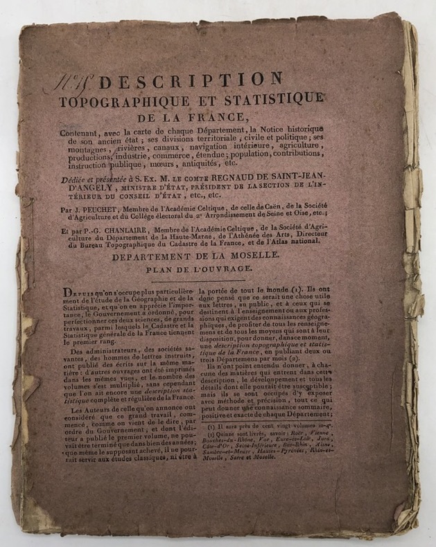Un des 49 fascicules qui composent la Description topographique et statistique de la France (le quinzième). Commencée en 1807, cette entreprise ne fut jamais terminée.Quérard VII, 103. - - VENTE PAR CORRESPONDANCE UNIQUEMENT