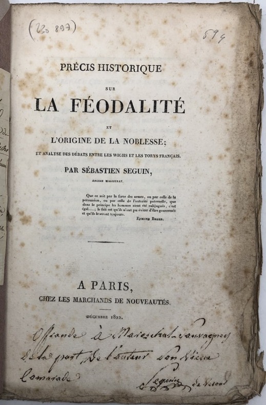 Unique édition de cet opuscule circonstanciel (la préparation des élections en Haute-Saône), mais révélateur des rancoeurs accumulées contre l'ancien Second Ordre, et persistant sous la Restauration.Saffroy I, 8011 (la référence 8012 de l'honorable bibliographe concerne en fait la même et seule édition de l'opuscule, mais indexée à l'imprimeur de Vesou, et de seconde main).Envoi autographe de l'auteur à "son vieux camarade" Mareschal-Sauvagney. Cette famille, une des six branches des Mareschal de Franche-Comté, s'est éteinte en 1851. C'est Seguin lui-même qui a contrecollé en regard du titre un "Avertissement" manuscrit, dans lequel il donne une précision sur le titre : "Le manuscrit, livré à la presse, pour l'époque des assemblées électorales de Haute-Saône, était d'abord intitulé : Idée légère de la féodalité et de l'origine de la noblesse, par suite analyse des débats (...)". S'ensuivent d'amères récriminations contre l'"aristarque-imprimeur" [Claude-Ferdinand Bobillier, de Vesoul] ... - - VENTE PAR CORRESPONDANCE UNIQUEMENT