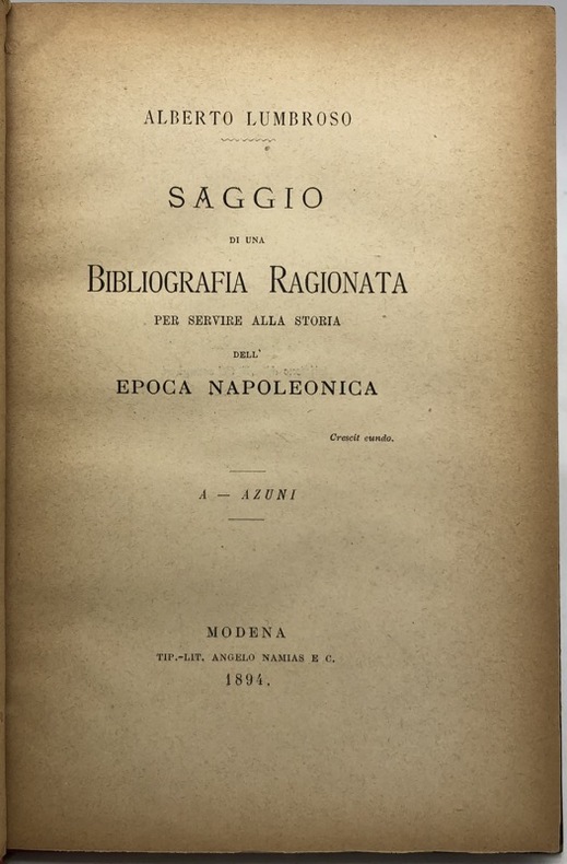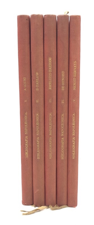 Tirage limité à 200 exemplaires. C'est malheureusement tout ce qui a pu paraître de cette tentative de bibliographie critique d'excellente tenue, la première à avoir été tentée sur l'Empereur et son époque : issu d'une famille franco-italienne, Alberto Emmanuele Lumbroso (1872-1942) se passionna très tôt pour l'érudition napoléonienne ; il fut le président du Comitato internazionale per il centenario della battaglia di Marengo, dirigea la Revue napoléonienne de 1901 à 1913. À partir de 1907 en revanche, ses centres d'intérêt se transformèrent peu à peu et s'orientèrent vers l'étude du Risorgimento.I. A - Azuni : XXIV pp., 155 pp. - II. B - Barlow : XXIV pp., 153 pp. - III. Barluzzi - Bazzoni : VIII pp., 179 pp. - IV. Be - Benoist Lamothe : XV pp., 148 pp. - V. Benoît - Bernays : XV pp., 144 pp.Exemplaire du marquis Fernand-Bernard de Sassenay (1829-1899), avec vignette ex-libris héraldique contrecollée sur les premières gardes. - - VENTE PAR CORRESPONDANCE UNIQUEMENT