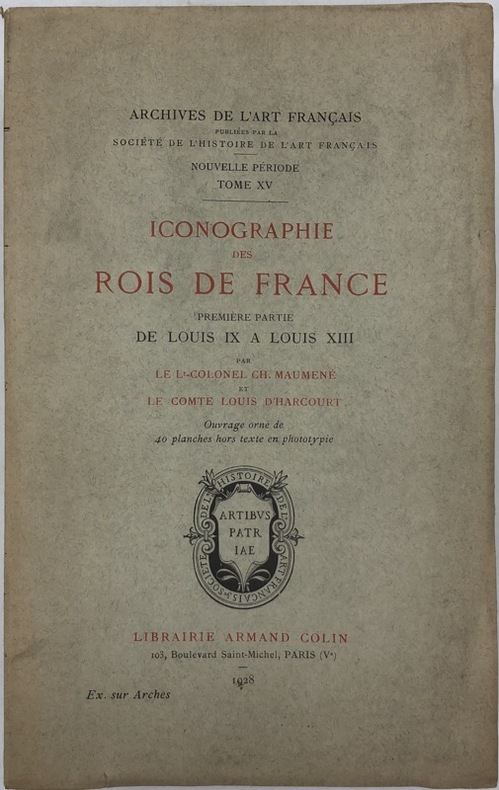 1929 Librairie Armand Colin, 1929-19312 volumes , in- 8 brochés, , couvertures impimées en noir et rouge, "Collection de la Société de l'Histoire de l'Art Français", VII-302 p. - VII-554 p , chaque tome orné de 40 planches hors texte en phototypie, Tome 1 : Introduction. Bibliographie générale - Les Capétiens - Les Valois - Les Bourbons - Appendices - Table des artistes cités. Tome 2 : Louis XIV, Louis XV, Louis XVI : Portraits, Le Roi dans les scènes historiques, Histoire du Roi par l'allégorie. Glorifications - Bibliographie