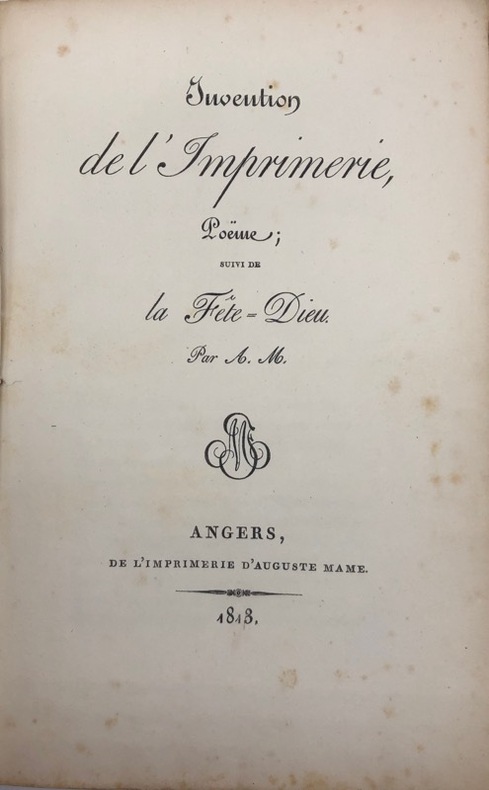 Unique édition, rare. Qui de mieux placé pour composer cet éloge de la typographie mobile que l'imprimeur Philippe-Auguste Mame (1778-1824), issu d'une lignée déjà importante de libraires angevins ? Il était en effet le quatrième fils de l'imprimeur-libraire Charles-Pierre Mame, à qui il succéda en 1802, en association avec son frère Charles-Mathieu Mame jusqu'en 1807. Breveté imprimeur le 15 juillet 1811 et libraire le 1er janvier 1813, l'année de notre poème, il fut Imprimeur du Roi à partir du 4 juillet 1814, mais perdit ce titre en 1818 pour avoir imprimé "L'Abrégé de l'origine des cultes" de Dupuis, dénoncé comme contenant des principes favorisant l'athéisme ...Absent de Quérard. Seulement deux exemplaires au CCF (Nantes et Tours).Envoi autographe signé de l'auteur à Monsieur Hébert fils, notaire. Cet envoi résout la question de l'attribution du poème à Auguste Mame, encore en suspens dans certains catalogues. - - VENTE PAR CORRESPONDANCE UNIQUEMENT