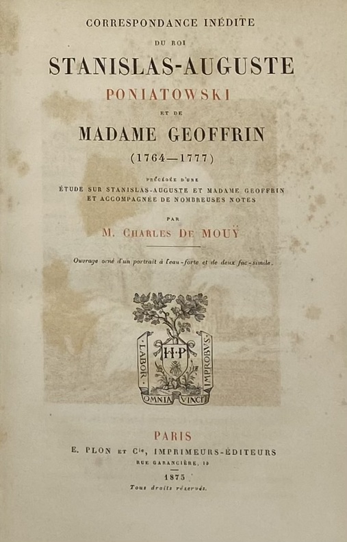 La correspondance que Stanislas Auguste Poniatowski entretint avec Marie-Thérèse Geoffrin (1699-1777), «la muse » d'un des salons parisiens les plus renommés. Elle ouvrit son salon de le rue Saint-Honoré en 1748 ; il fut, vingt-cinq ans durant, un des endroits les plus fréquentés de Paris. Poniatowski (1732-1798), futur roi polonais, fut introduit dans le salon de Mme Geoffrin par son père en 1753. A cette époque, le jeune Poniatowski passait quelques mois à Paris.C'est sur l'invitation de Stanislas Poniatowski (devenu le roi Stanislas Auguste II deux ans auparavant) que Mme Geoffrin visita la Pologne en 1766. Ce voyage, qui devait durer quatre mois et demi, était à l'évidence l'événement le plus important de sa vie : Mme Geoffrin n'était jamais sortie de Paris. Elle se rendit à Varsovie en passant, à l'aller comme au retour, par l'Allemagne et l'Autriche, où elle séjourna à Vienne. Elle fut reçue, lors de ses deux séjours viennois, chez le prince Kaunitz, qui mit à sa disposition son pavillon d'été du Mariahilf de Vienne. Les lettres qu'elle écrivit à Poniatowski sont le reflet de son séjour viennois.