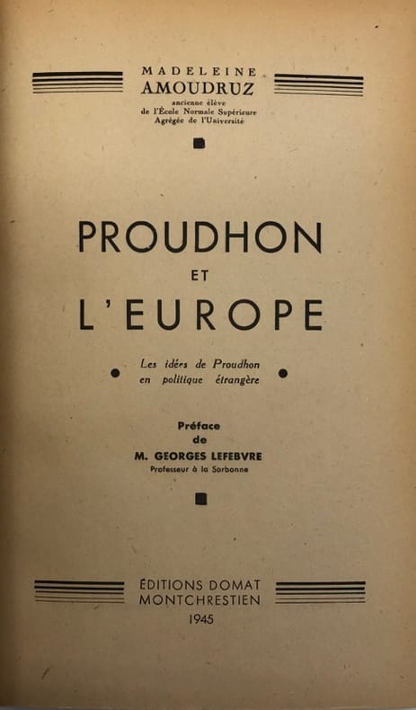 Madeleine Amoudruz est le nom de jeune fille de l'historienne Madeleine Rebérioux (1920-2005) : elle ne devait épouser le résistant communiste Jean Rebérioux que le 10 août 1946. C'est cette même année 1945 qu'elle avait été admise à l'agrégation, et, bien plus important, avait été remarquée par Georges Lefebvre, alors en plein pontificat historiographique.RELIÉ AVEC : BOURGEOIS (Nicolas) : Les Théories du droit international chez Proudhon. Le fédéralisme et la paix. Paris, Marcel Rivière, 1927, 138 pp., un f. n. ch. de table. - - VENTE PAR CORRESPONDANCE UNIQUEMENT