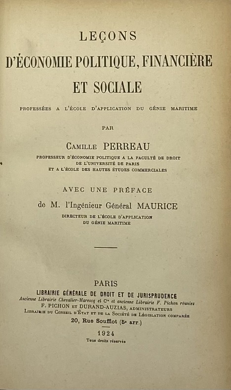 Unique édition. Enseignant et homme politique, Camille Perreau (1866-1952) professa l'économie politique à l'Université d'Aix-Marseille, où il fit figure de pionnier à l'époque, puis à la faculté de Paris, où il enseigna le cours d'introduction à l'économie de première année et de deuxième année. - - VENTE PAR CORRESPONDANCE UNIQUEMENT