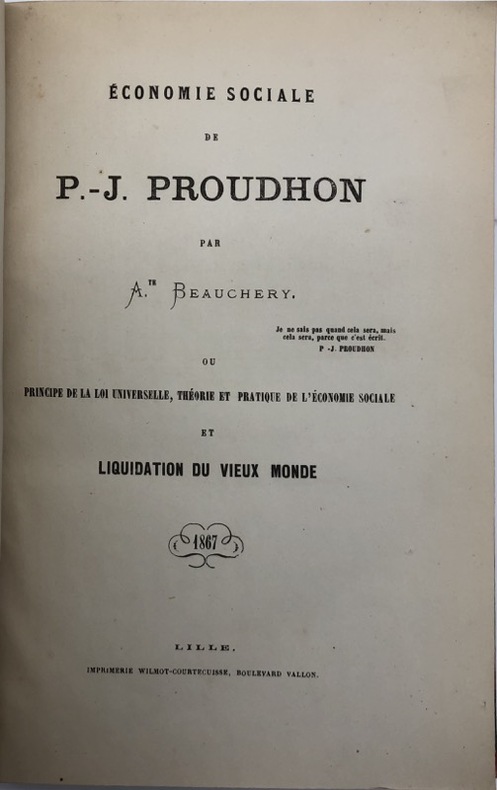 Unique édition, peu commune, de cet hommage à Proudhon, publié peu après sa mort : il se veut un résumé des thèses du penseur socialiste, et est précédé d'un mot de sa veuve, qui a manifestement effectué le service minimum et remis habilement le novice à sa place ("Ce n'est qu'avec plaisir que je vois la publication de votre livre, puisqu'il propage les idées de mon mari. S'il avait vécu, il vous aurait probablement donné quelques conseils. Je ne puis donc que vous féliciter et vous remercier de votre bonne intention").Auguste-Victor Beauchery (1830-1904) était alors un admirateur béat ; il devint un internationaliste actif à Bruxelles à partir de 1874, avant d'être accusé par ses camarades de "bonapartisme" en 1876 et de devoir retourner à Paris. Les moeurs des groupuscules ne changeront jamais ... - - VENTE PAR CORRESPONDANCE UNIQUEMENT