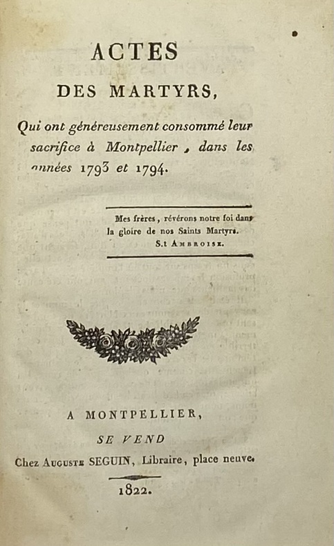 A Montpellier, Se vend chez Auguste Seguin, 1822 in-8, 32 pp., cartonnage papier marbré (reliure postérieure).