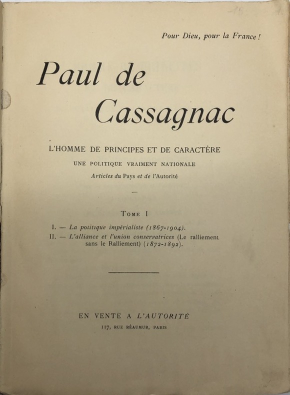 Particulièrement rare complète, cette série posthume réunit les principales contributions du journaliste aux périodiques où il donnait libre cours à sa verve : fils de Bernard-Adolphe (1806-1880), qui, déjà, avait été un fervent du Second Empire, le journaliste Paul Granier de Cassagnac (1842-1904), familier des invectives et des propos outranciers qui lui valurent nombre de duels, poursuivit la voie paternelle, et se montra même un adversaire irréductible de la nouvelle république (en 1881, il devait se présenter aux élections dans l'arrondissement de Mirande comme "candidat de la haine contre la République"). L'homme était en résumé un Léon Daudet bonapartiste. C'est lui qui inventa le surnom de "la Gueuse", pour désigner le nouveau régime.I. La politique impérialiste (1867-1904). L'alliance et l'union conservatrices (le ralliement sans le ralliement) (1872-1892) : [2] ff. n. ch., 608 pp. - II. Après le ralliement : [2] ff. n. ch., 471 pp. - III. La République sans masque (1900-1904) : [2] ff. n. ch., 604 pp. - IV. Choix de discours politiques : [2] ff. n. ch., 724 pp. - V. Effigies républicaines : [2] ff. n. ch., 360 pp. - VI. Questions morales et religieuses : [2] ff. n. ch., 430 pp. - VII. Questions sociales et économiques : [2] ff. n. ch., 441 pp. - VIII. Questions politiques et sociales : [2] ff. n. ch., 486 pp. Au CCF, seuls Aix-Marseille signalent des volumes (mais pas la série complète). - - VENTE PAR CORRESPONDANCE UNIQUEMENT