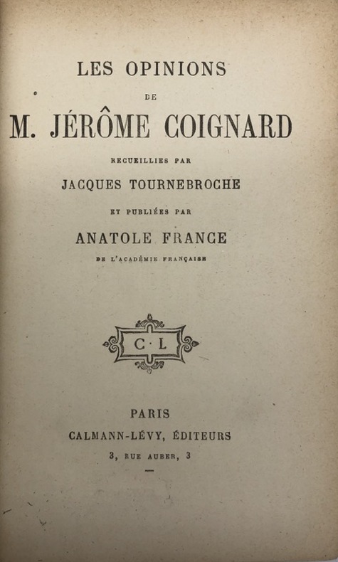 L'édition originale était parue en 1893. Cette fantaisie critique rétrospective mériterait d'être relue, ne serait-ce que pour le style : le narrateur, fils de maître Léonard, rôtisseur à l'enseigne de "La Reine Pédauque" vis-à-vis de Saint-Benoît-le-Bétourné, est le jeune Jacques Tournebroche ; au cours de ses entretiens avec son docte précepteur, vers 1720, il tire des enseignements si profitables qu'il jugea bon de transcrire. Voilà comment sont "parvenues" jusqu'à nous les opinions de Jérôme Coignard, abbé épicurien et cynique, plus contemporain de Loisy et Turmel que du Régent et de l'abbé Dubois.Vicaire III, 812 (pour l'originale). - - VENTE PAR CORRESPONDANCE UNIQUEMENT - LIEN DE PAIEMENT, NOUS CONSULTER.