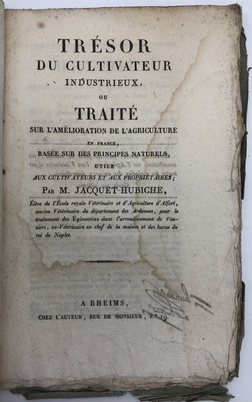 Unique édition, fort rare. Le titre de départ porte : "Mémoire présenté à la Société royale et centrale d'agriculture, sciences et arts de Paris, sur la connaissance et la découverte d'un nouveau moyen d'engrais, trop peu usité, très-avantageux pour l'agriculture en France, et propre à remplacer l'usage des fumiers en tous genres pour les terres convenables aux céréales ainsi qu'aux prairies artificielles, par la tourbe et tous les terrains tourbeux et sulfureux".Charles-Nicolas Jacquet (1770-1850), qui avait apposé à son patronyme celui de sa femme, était artiste vétérinaire.Un seul exemplaire au CCF (BnF). - - VENTE PAR CORRESPONDANCE UNIQUEMENT