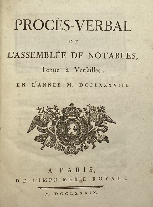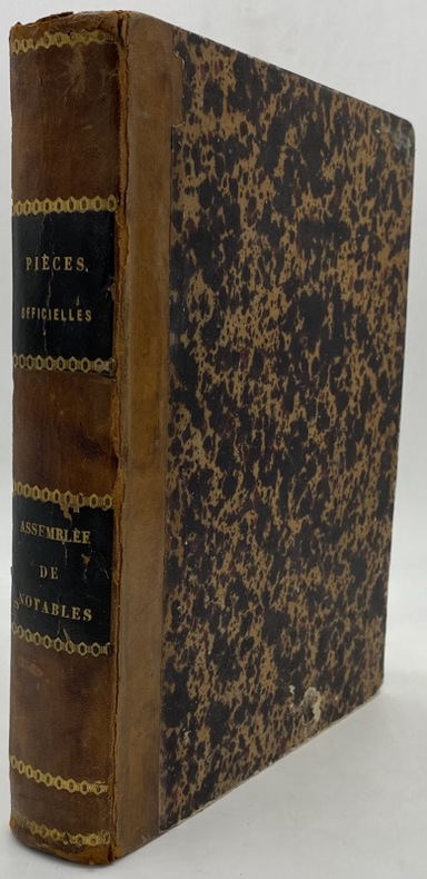 Paris, Imprimerie royale, 1789 in-4 carré, [2] ff. n. ch., 505 pp., avec un plan de la salle des notables hors texte légendé d'un feuillet en regard, demi-basane fauve mouchetée, dos lisse orné de filets dorés, pièces de titre cerise, tranches mouchetées de rouge (reliure de l'époque). Coiffes rognées, coins et coupes frottés, des mouillures claires supra-paginales.