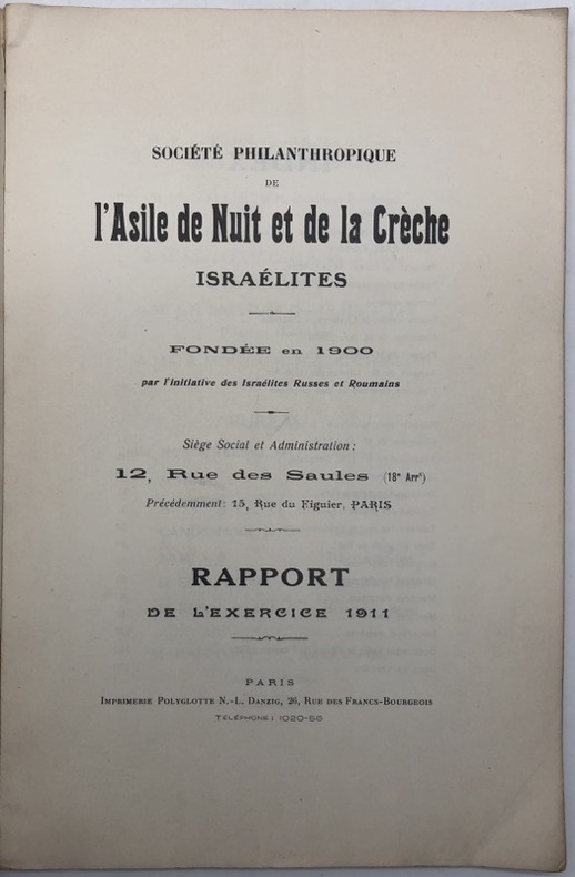 Très rare. Alors sise 12, et 42, rue des Saules depuis 1910, cette association devint le "Centre israélite de Montmartre" en 1976 (il existe toujours et est spécialisé dans l'hébergement des sans-abri). En 1900, son activité consistait essentiellement en un asile de nuit, "pour accueillir et loger temporairement les réfugiés de passage à Paris et leur fournir des aliments chauds". Puis, en 1910, furent adjoints une crèche et un ouvroir.Un seul exemplaire au CCF (BnF). - - VENTE PAR CORRESPONDANCE UNIQUEMENT
