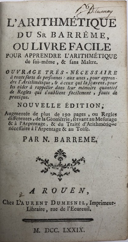 La première édition était parue en 1677 sous le titre Le Livre facile pour apprendre l'arithmétique de soi-même. Les rééditions augmentées sont extrêmement nombreuses jusqu'au début du XIXe siècle.Quérard I, 192.Ex-libris manuscrit Delaunay. - - VENTE PAR CORRESPONDANCE UNIQUEMENT