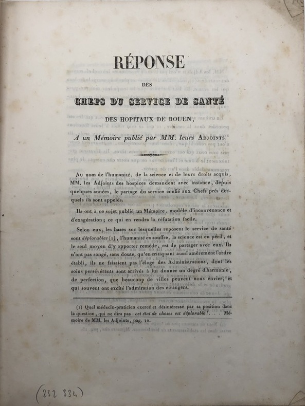 Rarissime et des plus intéressants : empreint d'une hauteur et d'une morgue toutes mandarinales, ce factum est signé de trois sommités médicales rouennaises, parmi lesquelles on aura reconnu le père de l'écrivain Gustave Flaubert, le chirurgien en chef Achille-Cléophas Flaubert (1784-1846) ; mais il y a également Antoine Blanche (1785-1849), issu d'une célèbre dynastie médicale et alors médecin en chef de l’Hospice général de Rouen et de la prison de Bicêtre, et aussi Clément-Eugène Hellis (1794-1877), alors médecin en chef de l'Hôtel-Dieu.Les trois immenses personnages prennent de haut leurs jeunes adjoints, exactement comme aujourd'hui un chef de service ses internes : "En traitant avec une aussi inconcevable légèreté ceux qui les ont précédés dans la carrière, et qui se sont voués à leurs fonctions avec un zèle qui n'a peut-être été méconnus que d'eux seuls, ils n'ont pas réfléchi que, dans leur proscription, se trouvaient compris tous ceux qui ont exercé aux mêmes titres. Ils déversent gratuitement le blâme et l'insulte sur ce que notre cité compta de plus recommandable dans l'art de guérir". Et ainsi de suite.Aucun exemplaire au CCF. Absent de Frère (qui cite tous les écrits de Hellis).Ex-libris manuscrit Fontenilliat, résidant Quai du Havre (cette famille bourgeoise comporte de nombreux membres à cette époque, il est difficile d'identifier celui-ci, peut-être le financier Henry Frédéric, 1793-1864). - - VENTE PAR CORRESPONDANCE UNIQUEMENT