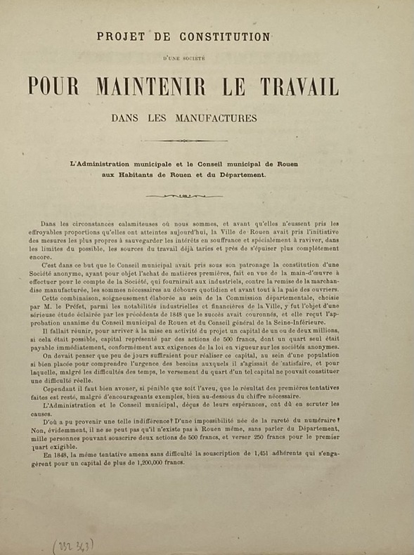 Approbation par le Conseil municipal de Rouen de la création de la société anonyme Union des intérêts départementaux, municipaux et industriels, destinée à maintenir les activités manufacturières en pleine débâcle de la Guerre franco-prussienne.Au CCF, exemplaires seulement à la BnF.ON JOINT : un bulletin (in-12 oblong) de souscription d'actions. - - VENTE PAR CORRESPONDANCE UNIQUEMENT