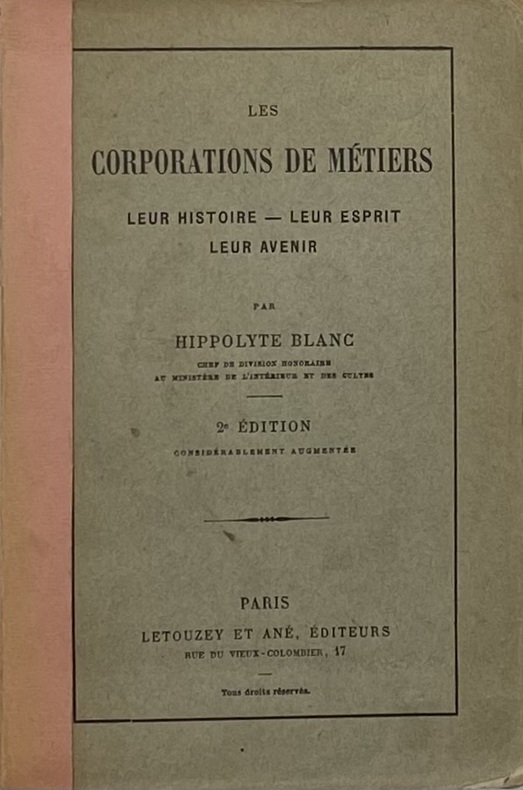 La première édition est de 1888 et en comprend que 358 pp.Jacques-Hippolyte Blanc (1820-1897) composa, sur l'organisation du travail et le corporatisme, de nombreuses publications sociologiques, statistiques, historiques et anthropologiques qui ont largement inspiré le Catholicisme social. - - VENTE PAR CORRESPONDANCE UNIQUEMENT