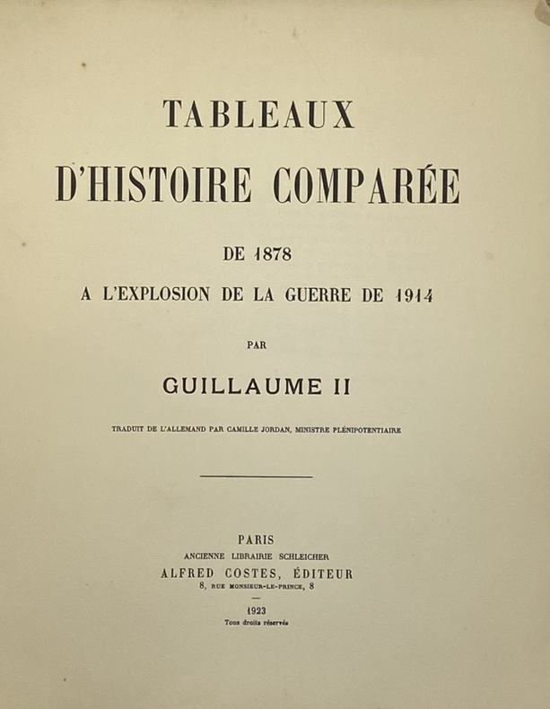 Unique édition française des Vergleichende Gechischtstabellen.Rédigés en 1919 pour l'usage personnel du Kaiser, ils connurent une impression à tirage limité en 1920, puis furent diffusés par le journal néerlandais Het Volk en 1921. Ils étaient censés donner un exposé neutre de la situation diplomatique de l'Europe depuis le Congrès de Berlin ; il va sans dire que les deux historiens français qui ont rédigé le texte introductif mettent en pièce cette prétendue impartialité, d'une manière qui semblera excessive de nos jours, et voient dans le document un essai d'auto-justification de l'Empereur, regardé à cette époque comme l'un des principaux responsables de la Guerre de 1914 par les Alliés (c'était quasiment un dogme politique de 1914 à 1933). - - VENTE PAR CORRESPONDANCE UNIQUEMENT