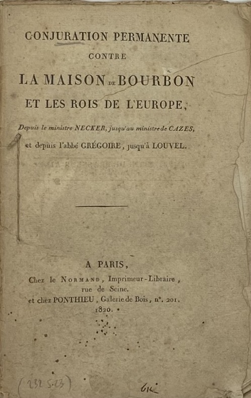 Composé après le choc de l'attentat de Louvel, l'opuscule est un excellent exemple du délire "complotiste" qui avait saisi les milieux royalistes attachés aux Bourbons : c'est au XVIe siècle que l'auteur va chercher les responsables originaux du régicide, et une longue théorie de complices est évoquée, jusqu'à l'absurde. - - VENTE PAR CORRESPONDANCE UNIQUEMENT