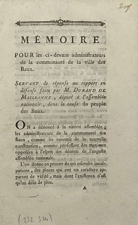 Rare. La pièce de Durand de Maillane, publiée la même année, s'intitule : Rapport en défense dans la cause du peuple des Baux en Provence contre le prévôt-général de la maréchaussée de cette province.Au CCF, exemplaires à la BnF, Draguignan, Grenoble et Le Havre. - - VENTE PAR CORRESPONDANCE UNIQUEMENT