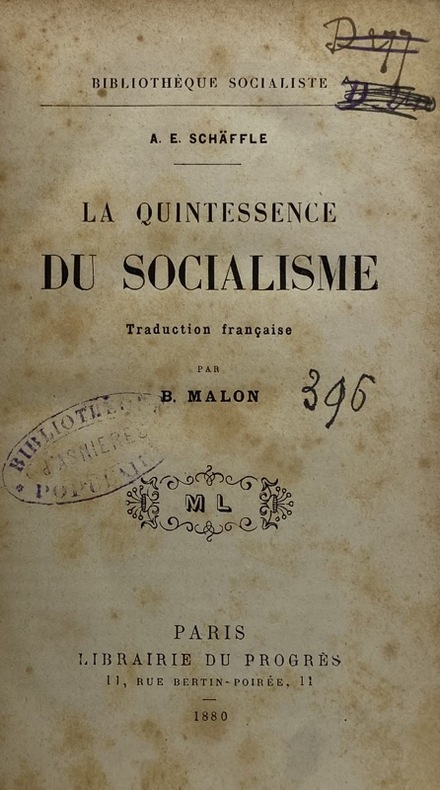 Édition originale de la traduction française, donnée par Benoît Malon (1841-1893), qui y lisait sûrement la confirmation de ses positions "possibilistes" (= réformistes) contre celles de Guesde. L'originale allemande était parue dès 1874 sous le titre de Die Quintessenz des Sozialismus. Le théoricien politique Albert Schäffle (1831-1903), qui fut un moment ministre du commerce autrichien, n'était nullement révolutionnaire et y développait l'idée que le socialisme classique et la démocratie étaient incompatibles.Cachet humide de la Bibliothèque populaire d'Asnières, fondée précisément en 1871 par des militants socialistes de la lecture populaire, dont certains avaient déjà participé activement à la fondation d’autres bibliothèques (comme la célèbr Bibliothèque des Amis de l’Instruction du IIIe arrondissement de Paris. Rappelons aussi que c'est dans cette localité que mourut Benoît Malon. Cf. Nadeeo (Étienne) : La Bibliothèque populaire d’Asnières en plein succès (1894-1945) : de la lecture populaire à la lecture publique ? in : Des bibliothèques populaires à la lecture publique (Villeurbanne, 2014). - - VENTE PAR CORRESPONDANCE UNIQUEMENT