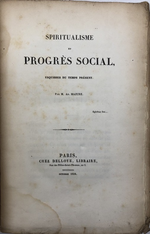 Unique édition. Professeur de philosophie au Collège royal de Poitiers et inspecteur d'académie, Paul-Adolphe Mazure (1799-1870) fut un polygraphe aux intérêts variés. Il se penche ici sur les fondements philosophiques possibles d'une amélioration des conditions de vie. - - VENTE PAR CORRESPONDANCE UNIQUEMENT