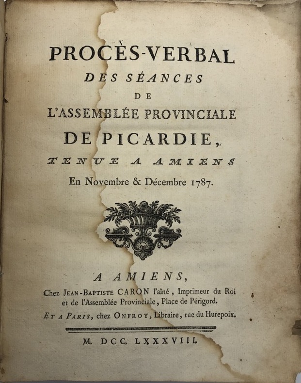 Amiens, Jean-Baptiste Caron l'aîné, Paris, Onfroy, 1788 in-4, [2] ff. n. ch., vij pp. de table des séances, 335 pp., [7] ff. n. ch. de table des matières, broché sous couverture d'attente de papier jaune. Manque le dos, fortes mouillures en début d'ouvrage, traces d'humidité aux coins des ff., infime travail de ver dans les marges.
