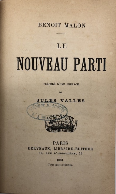 Réunit les deux tomes du Nouveau parti (le premier en édition originale) ; avec Le Parti ouvrier en France (1880), ce sont les seuls titres de Benoît Malon qui firent, de son vivant, l'objet d'un début de publication collective, lequel ne fut pas poursuivi. - - VENTE PAR CORRESPONDANCE UNIQUEMENT