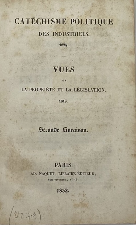 Il s'agit de la réédition, procurée par Olinde Rodrigues au moment de sa scission, des deux premiers cahiers (sur quatre) qui forment l'édition originale du Catéchisme des industriels, publiée entre 1823 et 1824, c'est-à-dire entre la tentative de suicide de Saint-Simon et sa mort.Fournel, pp. 30-32 (pour l'originale) ; pp. 99-100 (pour notre édition). Mazzone, 105-108 (pour les quatre cahiers de l'originale). - - VENTE PAR CORRESPONDANCE UNIQUEMENT