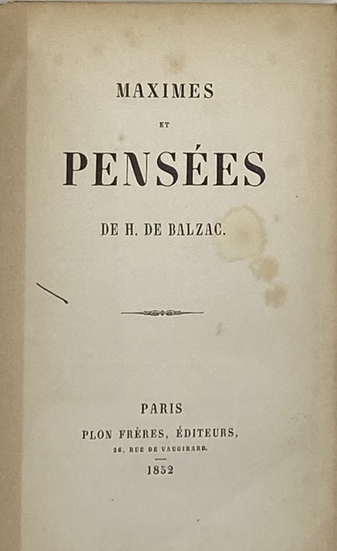 Première édition séparée de ce florilège qui réunit sentences et opinions extraites des diverses oeuvres de l'écrivain ; il sera réédité en 1856, puis en 1866 par Alphonse Pagès sous le titre de Balzac moraliste.Vicaire I, 232. Non cité par Clouzot.Ex-libris manuscrit Camille Jaussert. - - VENTE PAR CORRESPONDANCE UNIQUEMENT
