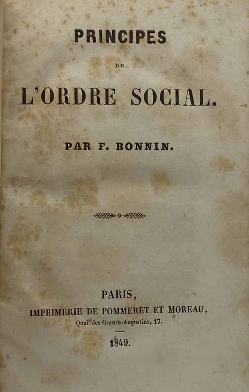 1777 DE L'ORDRE SOCIAL.Ouvrage suivi d'un Traité élémentaire sur la Valeur, l ' Argent, la Circulation,L'Industrie & le Commerce intérieur et extérieur.Relié avec :DE L'INTERET SOCIAL. Ouvrage élémentaire dans lequel on discute quelques principes de M l'Abbé de Condillac.Paris, Frères Debure , 1777 , in8 (13x20) plein veau,XXXI - 728pp.Pagination continue pour les 2 titres.Etiquette exlibris contemporaine de l'ouvrage de G M Remelein libraire à Rennes collée au dos de la page de faux titre.Edition originale dans un parfait état de conservation.
