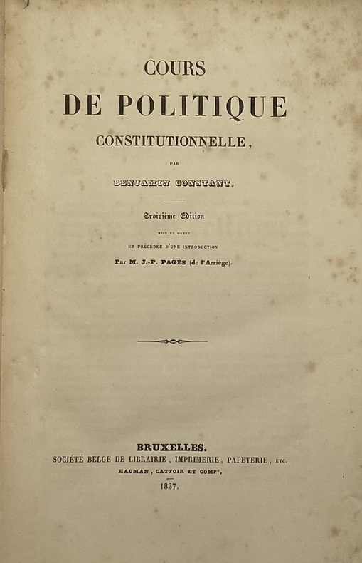 Rare édition intermédiaire entre l'originale de 1818-1820, dont les huit volumes forment comme une grande collective politique des écrits du penseur libéral, et l'édition de 1872 révisée et élaguée par Edouard Laboulaye (en deux volumes in-8). En raison de la rareté proverbiale de l'originale, cette contrefaçon belge en un seul volume donne un accès plus commode au texte primitif. Rappelons qu'il s'agit plus d'un recueil des écrits antérieurs de Constant qu'un traité nouveau. - - VENTE PAR CORRESPONDANCE UNIQUEMENT