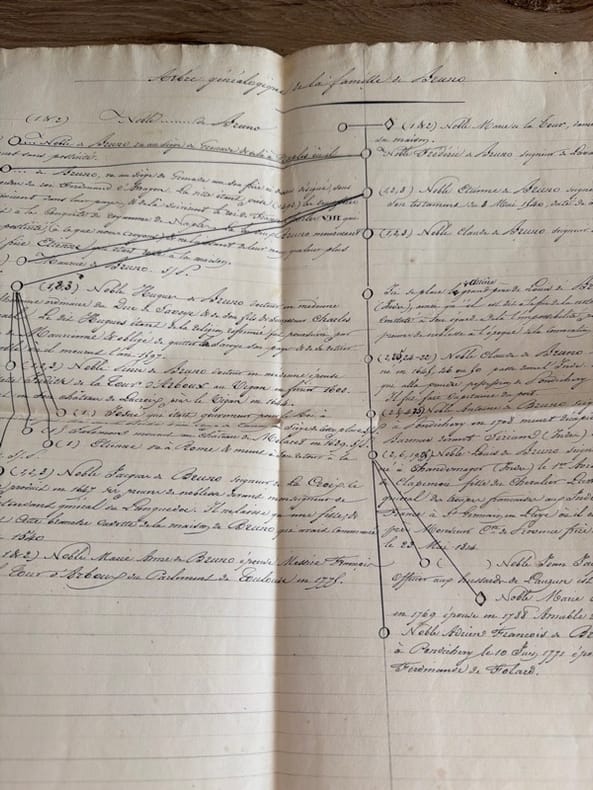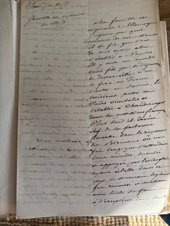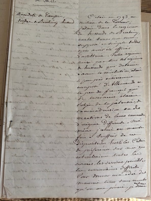 Intéressant ensemble de notes transcrivant des souvenirs épars du général Adrien-François de Bruno (1771-1861), qui s'illustra pendant les guerres napoléoniennes, et en particulier au service du roi Louis Bonaparte en Hollande (1806-1810).On n'a pas affaire ici à une narration continue, mais à une suite d'épisodes sans lien, correspondant à diverses périodes de la vie de Bruno, et regroupés sous quelques têtes de chapitres (que nous transcrivons plus bas). En bref, des matériaux pour un projet de rédaction sans doute plus important, mais qui n'a pas vu le jour. L'écriture est régulière, moyennement lisible, comportant de nombreuses ratures et biffures. L'examen de détail ne peut faire exclure des enjolivements rétrospectifs et des confusions de date (e.g. il est malaisé de rattacher exactement la mission de Saint-Just et Lebas du III avec un commandement précis de Kléber ; l'anecdote du IV ne peut se placer en cohérence avec ce qui est raconté de l'engagement de Bruno en II, etc.). Probablement, le général était fort âgé quand il dicta ces notes, car il est certain qu'il ne les rédigea pas lui-même, comme le fait savoir l'introduction du VII : "Peu studieux dans son enfance, aimant désordonnément le plaisir , le mouvement et les émotions d'une vie aussi agitée qu'active, M/O n'avait jamais eu le goût de la plume et sa répugnance pour l'écriture avait fini par devenir telle que souvent il négligeait les affaires les plus importantes, faute de pouvoir se décider à mettre de l'encre sur une feuille de papier". Dans ce contexte, la mention M/O que l'on rencontre aux titres de plusieurs de ces souvenirs ainsi qu'au titre général semble signifier "mon oncle", ce qui signifierait que le secrétaire était un des enfants ou petits-enfants de sa soeur Marie-Blanche de Milanges (cf. infra). C'est lui qui suggéra à Bruno de rédiger des mémoires, selon la vogue qui poussait les acteurs de la période napoléonienne à coucher par écrit leurs exploits.On a donc, par ordre chronologique :I. Famille et naissance de M/O : [2] ff. n. ch. "Ma famille est originaire d'Allemagne. J'ignore par quel concours de circonstances, il se fit que l'un de mes ayeux alla s'établir à Naples. Il y mit au monde trois fils qui se dispersèrent de divers côtés. L'un se fixa en France, l'autre en Savoie, le troisième passa aux Indes orientales et s'établit à Chandernagor dans les possessions françaises". C'est ce dernier fils, Antoine de Bruno (1708-1757), qui est le grand-père du narrateur ; il serait mort décapité au cours d'une guerre interne à la Birmanie. Son fils unique, Louis de Bruno (1739-1814) eut à son tour trois enfants de son mariage avec Marie-Josèphe Law de Clapernon, parente de Law de Lauriston, dont le dernier est notre narrateur, Adrien-François de Bruno (né le 10 juin 1771 à Pondichéry). Quand ce dernier approcha ses cinq ans, ses parents décidèrent en 1776 de revenir se fixer en France.II. Fuite en Auvergne, arrestation, entrée au service : [8] ff. n. ch. "Mes parents me destinant au service militaire, aussitôt que je fus engagé, on me mit à l'École d'artillerie de La Fère. J'étais aspirant d'artillerie quand la révolution de 1789 éclata. Mon frère aîné [Jean-Jacques de Bruno, 1768-1790] était déjà au service avant moi et officier dans le régiment de hussards de Lauzun lorsque ce régiment, travaillé par l'esprit révolutionnaire, se révolta contre ses officiers et les massacra. Mon malheureux frère fut au nombre des victimes". À la suite de ces événements, le père d'Adrien le retira de La Fère et toute la famille quitta Paris pour se réfugier en Auvergne, dans la propriété de la soeur d'Adrien, Marie-Blanche, qui avait épousé Amable de Milanges (1765-1818) et habitait une propriété sise entre Gannat et Aigueperse. Imprudent dans ses paroles, le jeune Adrien fut bientôt recherché dans la région comme contre-révolutionnaire exalté : caché dans les bois de Randan, il fut rapidement convoyé vers la Vendée où il pensait s'engager dans les rangs des insurgés. Mais, dénoncé par une servante suspicieuse au comité local, il fut incarcéré et ne dut son salut qu'à son engagement dans la Légion de la Nièvre, qui alla bientôt servir à Landrecies. Rien n'est dit de l'engagement ultérieur du jeune homme dans la cavalerie du 4e Régiment de Hussards, où il commença réellement sa carrière militaire (en septembre 1793).III. Anecdote du général Kléber : [2] ff. n. ch. "On sait que le général Kléber, au milieu des grandes qualités qui le distinguaient, avait la manie d'affecter les manières et le langage des soldats républicains d'alors et de ne parler que par F... et par B..., suivant la mode d'alors". Suit une conversation salée que Kléber aurait eue à un dîner en compagnie des conventionnels Saint-Just et Philippe Lebas, représentants en mission auprès de l'Armée du Nord (avril 1794), et qui portait sur la difficulté de prendre la parole devant la Convention nationale.IV. Anecdote de Taupin, soldat de Bercheny : [5] ff. n. ch. "C'était en 1793, au milieu de la Terreur ; j'étais dans le Régiment de hussards de Bercheny, caché sous un nom supposé, et simple soldat après avoir été officier d'artillerie. Notre régiment ainsi que tous les régiments de hussards qui dataient d'avant la Révolution, était à peu près entièrement composé d'Allemands et le peu de Français qui s'y trouvaient étaient l'objet de la jalousie, de l'animadversion ou des vexations de leurs camarades d'origine différente". Où le jeune soldat Bruno prend la défense d'un bûcheron de la Nièvre enrôlé dans le corps et qui servait de souffre-douleur aux soldats allemands.V. Les magistrats de Soleure : [6] ff. n. ch. "Pendant la campagne de Suisse de l'année 179.., j'étais déjà major et je commandais par intérim le 12e Régiment de Hussards, ci-devant Bercheny. Le général Ney (plus tard mar