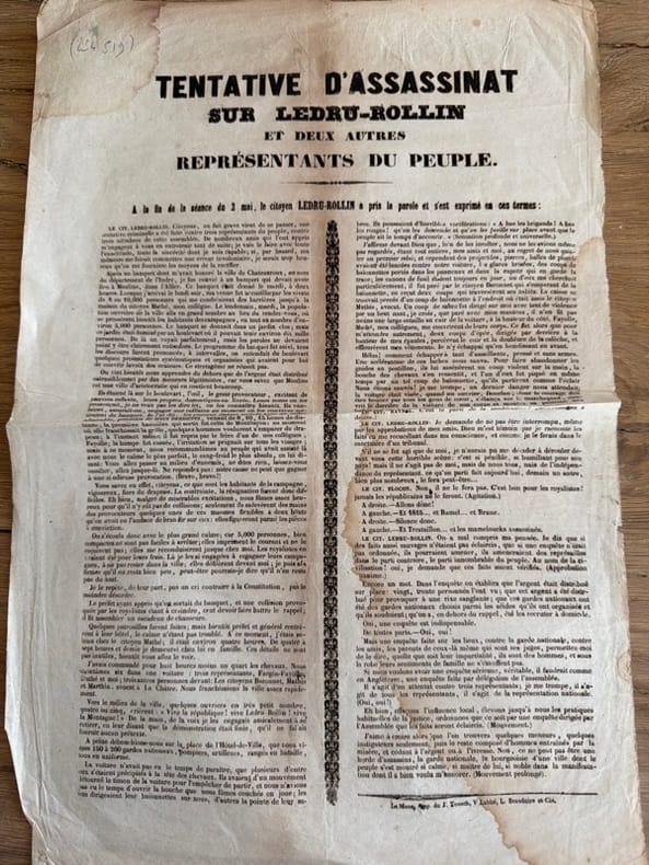 Cette tentative - plutôt une échauffourée montée en épingle - eut lieu à Moulins (Allier), à l'occasion d'un banquet offert par les républicains de la ville. Ledru-Rollin venait de Châteauroux, ayant entrepris une grande tournée provinciale pour assurer la promotion des idées républicaines.Un seul exemplaire au CCF (BnF). - - VENTE PAR CORRESPONDANCE UNIQUEMENT - LIEN DE PAIEMENT, NOUS CONSULTER.