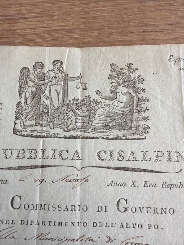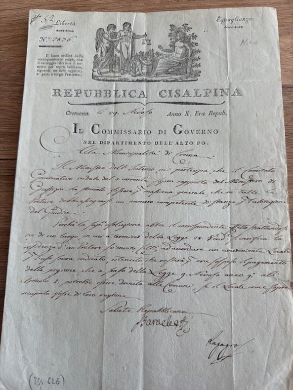 Pièce manuscrite sur formulaire pré-imprimé, adressé à la municipalité de Crema, et portant sur l'organisation des tribunaux : "che in tutte le preture debba assegnarsi un numero competente di stanze & l'abitazione del giudice".Le département de l'Alto Poavait été établi lors de la création de la république cisalpine sous le nom de "département du Pô" le 9 juillet 1797, et fut renommé le 5 novembre 1797 "département du Haut-Pô". Lors du remaniement départemental du 1er septembre 1798, le chef-lieu fut transféré à Mantoue, avant de revenir à Crémone.Belle vignette allégorique en en-tête. - - VENTE PAR CORRESPONDANCE UNIQUEMENT - LIEN DE PAIEMENT, NOUS CONSULTER.