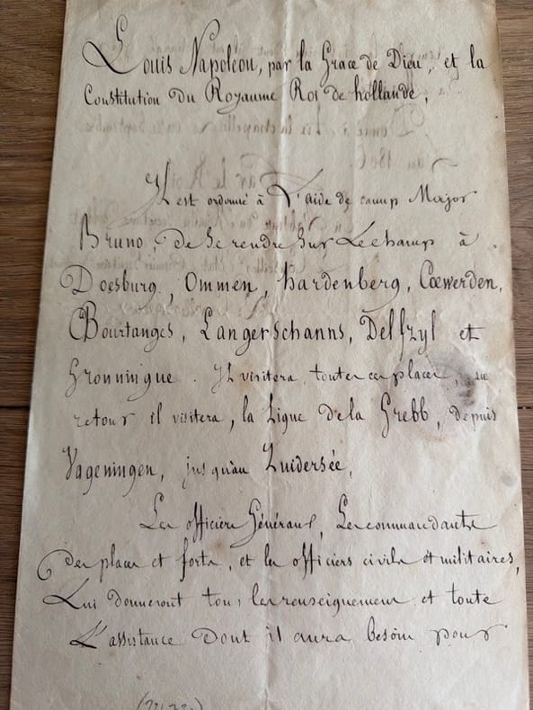 Signé en l'absence du ministre compétent par Jean-Louis Cuvillier-Fleury (1774-1815), alors premier secrétaire du cabinet de Louis Bonaparte, et père du futur critique Alfred-Auguste Cuvillier-Fleury (1802-1887).Il s'agit d'un ordre destiné au major Adrien-François de Bruno (1771-1861), aide-de-camp du Roi, pour qu'il inspecte les places de Doesburg, Ommen, Hardenberg, Coewerden [= Coevorden], Bourtanges, Langerschanns, Delfzyl [= Delfzijl] et Groningue. - - VENTE PAR CORRESPONDANCE UNIQUEMENT - LIEN DE PAIEMENT, NOUS CONSULTER.