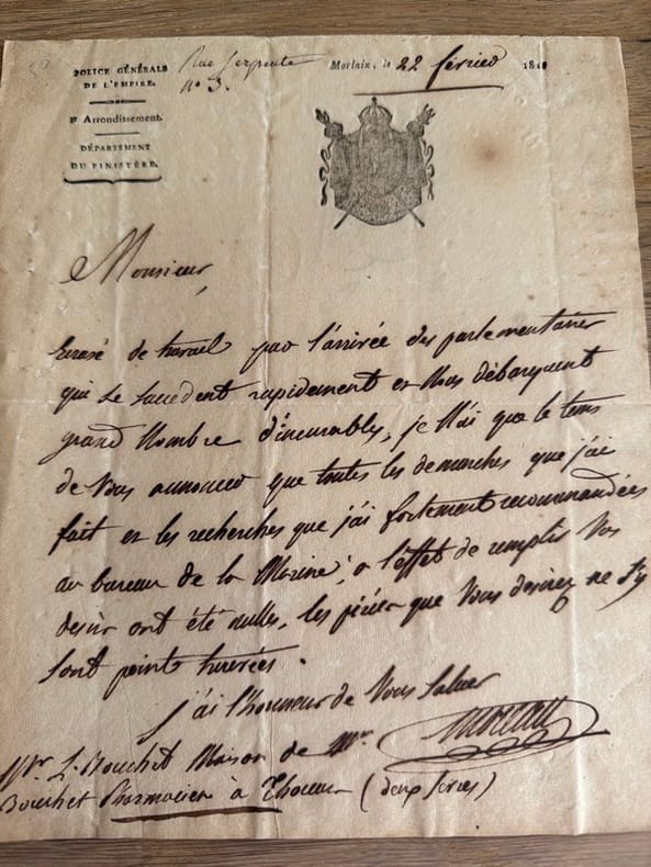 Morlaix, 22 février 1811 petit in-4, écrit sur la première page, en feuille.