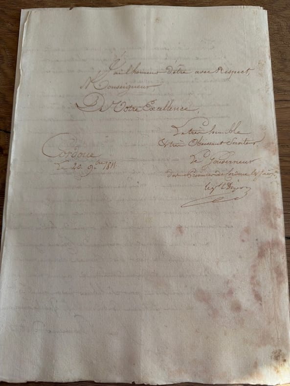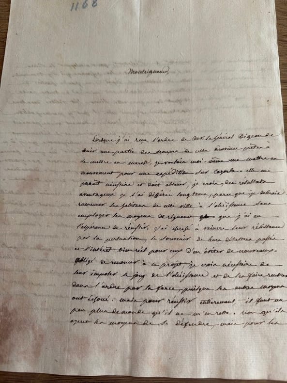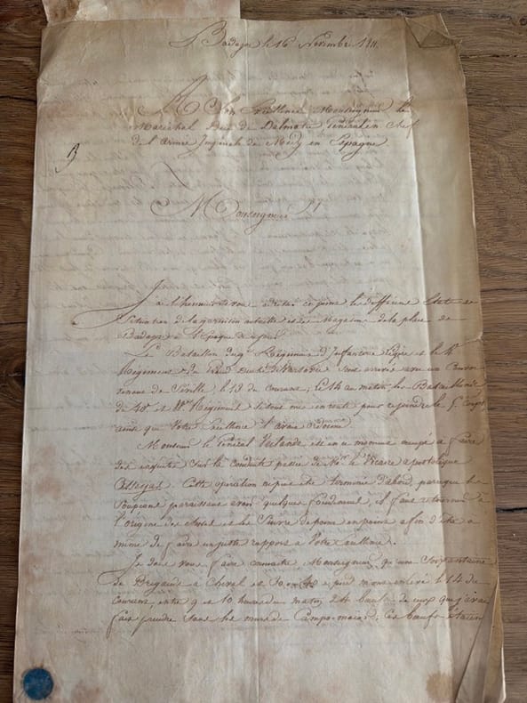 Petit dossier cohérent qui regroupe des copies ou des brouillons de rapports adressés au maréchal Soult duc de Dalmatie, ou à des officiers supérieurs sur la progression des opérations militaires en Espagne en ce mois de novembre 1811. Il manque manifestement à cet ensemble des lettres, mais ce qui est conservé donne un excellent tableau des opérations des Français en Andalousie, et aux alentours de Cadix.I. Du 23 octobre 1811, Paris : le ministre du trésor, Mollien, informe que l'Empereur a approuvé les conditions de remboursement de l'emprunt fait à Lugo pour le service des troupes d'Espagne (un bifeuillet in-folio de duplicata écrit sur trois pages).II. Du 13 novembre 1811, Jaén : lettre du général François-Antoine Lallemand (1774-1839), commandant supérieur de la province de Jaén, sur le manque de troupes pour assurer les communications (un bifeuillet in-folio écrit sur 3 pages).III. Du 14 novembre 1811, Jaén : lettre de Lallemand recommandant d'effectuer une expédition sur Cazorla (un bifeuillet in-folio entièrement écrit). IV. Du 16 novembre 1811, Badajoz : lettre du général Philippon (1761-1836) au duc de Dalmatie (Soult) annonçant l'arrivée du 9e Régiment d'infanterie légère et du 4e du Grand Duché de Varsovie avec un convoi provenant de Séville (un bifeuillet in-folio écrit sur 3 pages).V. Du 16 novembre 1811, Montellano (Andalousie) : rapport du général Jean-Baptiste-Pierre Semellé (1773-1839), commandant de la 2e division du 1er corps de l’armée d’Espagne, à Soult, sur son arrivée dans la localité (un bifeuillet in-4 écrit sur 3 pages). VI. Du 17 novembre 1811, Villamartin (Andalousie) : rapport de Semellé à Soult, sur ses mouvements en Andalousie (un bifeuillet in-4 entièrement écrit).VII. Du 17 novembre 1811, Cordoue : lettre du général Victor de Faÿ de Latour-Maubourg (1768-1850) à Soult, sur les mouvements du Régiment de Hesse-Darmstadt parti escorter un convoi pour Badajoz (un bifeuillet in-folio entièrement écrit).VIII. Du 18 novembre 1811, Almeria : compte rendu du chef de bataillon Duport sur une attaque de 1200 partisans qui eut lieu la veille (un feuillet in-folio écrit au recto).IX. Du 20 novembre 1811, Cordoue : lettre de Latour-Maubourg à Soult l'informant de l'autorisation de l'attaque sur Cazorla souhaitée par Lallemand (cf. pièce III) (un bifeuillet in-folio entièrement écrit). Ci-joint deux lettres de Lallemand du 19 et du 20 courant rendant compte de ses dispositions, et prévient qu'un corps ennemi a paru à El Castellon, etc.X. Du 20 novembre 1811, Cordoue : rapport du général Alexandre Digeon (1771-1826) à Soult, sur les dispositions prises de conserve avec Latour-Maubourg (7 pp. in-folio).XI. Du 21 novembre 1811, Cordoue : lettre de Latour-Maubourg à Soult sur la suite de la même affaire (un bifeuillet in-folio écrit sur 3 pages).XII. Du 21 novembre 1811, Antequera : lettre du général Jean-François Leval (1762-1834), commandant de la "division allemande" (une formation composée de la brigade hollandaise, du régiment de Nassau, du régiment de Bade, du régiment de Hesse-Darmstadt, d'un régiment de gardes nationaux de Paris et de quelques autres unités), à Soult, sur les dispositions prises pour chasser les partisans sévissant entre Grenade et Malaga (un bifeuillet in-folio écrit sur 3 pages, avec un billet joint du 23 novembre).XIII. Du 21 novembre 1811 : rapport du général Georges-Alexis Mocquery (1772-1847), chef de l'état-major général du premier corps (devant Cadix), sur les opérations de blocus du 16 au 20 novembre (un bifeuillet in-folio écrit sur 3 pages). XIV. Du 21 novembre 1811, Baza : transmission d'un rapport rédigé par le commandant des troupes d'Almeria sur la poursuite des partisans dans les Alpujarras (un feuillet in-folio entièrement écrit).XV. Du 21 novembre 1811, Bornos (près de Cadix) : le général Pierre Barrois (1774-1860) transmet une copie des instructions reçues du duc de Bellune (Perrin) et donne avis que l'ennemi rassemble toutes ses forces à Ximena (un bifeuillet in-folio écrit sur deux pages et copies des instructions de Perrin sur un bifeuillet joint écrit sur 3 pages).XVI. Du 23 novembre 1811, Madrid : lettre du marquis d'Almenara à Soult sur des mouvements préfectoraux dans le sud : "Les observations confidentielles que Votre Excellence a eu la bonté de m'adresser sur le compte de divers préfets d'Andalousie, m'ont paru trop importantes pour n'être pas mises sous les yeux de Sa Majesté" (un bifeuillet in-folio entièrement écrit).XVII. Du 23 novembre 1811, Madrid : lettre du marquis d'Almenara à Soult rendant justice aux efforts du maréchal pour assurer les subsistances en Andalousie (un bifeuillet in-folio écrit sur 3 pages).XVIII. Du 23 novembre 1811, Paris : lettre de Louis-Alexandre Berthier (1753-1815), major général des armées, à Soult, sur de nouvelles consignes concernant le transport des pièces de comptabilité (un feuillet in-4).XIX. Du 24 novembre 1811, Baza : compte rendu des mouvements de l'ennemi (un feuillet in-folio entièrement écrit).XX. Des 25 & 26 novembre 1811 : le duc de Bellune prévient de la marche du général Barrois sur Ronda (3 pièces in-4 ou in-folio, dont une copie des instructions au général Barrois).XXI. Du 25 novembre 1811, Baza : rapport relatif aux mouvements et projets de l'ennemi (est jointe une lettre du commandant d'Almeria sur l'occupation de Huercal).XXII. Du 25 novembre 1811, Paris : lettre de Berthier à Soult le laissant maître de composer à sa guise la garnison de Badajoz (un feuillet in-4 écrit sur une page).XXIII. Du 26 novembre 1811, Almendrajelo (vers Badajoz) : lettre de Jean-Baptiste Drouet d'Erlon (1765-1844), commandant le 5e corps, à Soult, sur les mouvements de Castanos et l'assassinat de plusieurs militaires (un bifeuillet in-folio entièrement écrit). Avec copie d'une lettre de Castanos à Drouet en date du 19 novembre (texte castillan et traductio