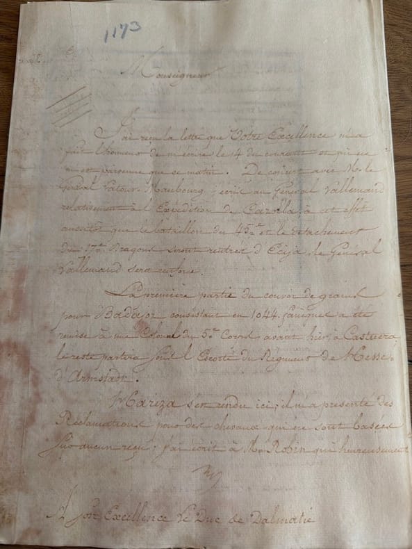 Petit dossier cohérent qui regroupe des copies ou des brouillons de rapports adressés à l'Empereur ou à des officiers supérieurs sur la progression des opérations militaires en Espagne en ce mois de décembre 1811. Il manque manifestement à cet ensemble des lettres, mais ce qui est conservé donne un excellent tableau des opérations des Français en Espagne.I. Du premier décembre 1811, Valence : rapport du général Nicolas de Loverdo (1773-1837), sous-chef d'état-major, au général Foy sur la situation de la place de Plasencia, qu'il commandait en l'absence de son supérieur (un feuillet in-folio écrit sur chaque page). Le ton est plutôt frais : "Vous avez ici un officier à vous avec qui j'ai dû avoir des rapports de service. Vous pouvez savoir très aisément si mes discours ou ma conduite ont pu provoquer la moindre inquiétude dans les esprits, et si, loin d'exagérer des dangers éloignés, j'ai pris froidement et dans le silence des mesures de précaution qui ne sont jamais inutiles".II. Du 5 décembre 1811, Barcelone : rapport du général Maurice Mathieu de La Redorte (1768-1833) au général Decaen, sur l'engagement avec la division du général de Sarfield [= Pedro Sarsfield, 1781-1837], qui gardait les défilés de Trenta Passas (un feuillet in-folio écrit au recto).III. Du 6 décembre 1811, Barcelone : lettre du général Decaen (1769-1832), commandant en chef de l'Armée de Catalogne, au ministre de la guerre, sur la garnison de Tarragone, portée de 800 à 1600 hommes (un feuillet in-4 écrit sur deux pages).IV. Du 7 décembre 1811, Talavera : arrêté de Marmont, duc de Raguse (1774-1852), commandant en chef de l'Armée de Portugal, déterminant le nombre de rations attribuables aux militaires et employés des différents grades (un bifeuillet in-folio entièrement écrit et regroupant 8 articles et un grand tableau).V. Du 7 décembre 1811, Paris : lettre de Louis-Alexandre Berthier (1753-1815), major général des armées, à l'Empereur, rendant compte de la transmission des ordres et instructions de Napoléon aux différents chefs de corps pour les opérations du siège de Valence, l'approvisionnement de Badajoz, les travaux de fortification de Santona et de Burgos (un bifeuillet in-4 entièrement écrit). Est jointe une lettre du même Berthier à Soult, commandant en chef de l'Armée du midi (un feuillet in-4 écrit au recto), concernant une mesure personnelle : "L'Empereur, Monsieur le Maréchal, ordonne de suspendre de ses fonctions le colonel Merlhes du 12e Régiment de dragons, employé à l'Armée du midi, dont l'incapacité a occasionné la perte d'un détachement dans les Alpuxarres [= Alpujarras]". Il s'agit de Jean-Gabriel-Marie Merlhes (1773-1835), qui sera mis en non-activité à la Première Restauration.VI. Du 8 décembre 1811, Paris : lettre non signée de Berthier à l'Empereur, l'informant que le général Le Paige D'Orsenne (1773-1812) a bien exécuté les ordres pour le placement des troupes de l'Armée du Nord de l'Espagne, et que la garnison d'Astorga a dû être en partie complétée par des membres de la Garde impériale (un feuillet in-4 écrit au recto).VII. Du 8 décembre 1811, Girone : rapport du général Decaen au ministre de la guerre sur une opération destinée à introduire un convoi dans Barcelone le 3 décembre dernier (5 pp. in-folio). Il s'agit de la même affaire déjà traitée par Mathieu dans la pièce II*. VIII. Du 8/16 décembre 1811, Talavera : rapport du général d'artillerie Louis Tirlet (1771-1841) sur les 484 hommes mis à sa disposition par le duc de Raguse (un bifeuillet écrit sur 3 pages).IX. Du 9 décembre 1811, Girone : lettre du général Decaen au ministre de la guerre [Henri-Guillaume Clarke], réclamant des secours en hommes et en numéraire pour les opérations de Catalogne, et spécialement pour empêcher les Anglais de débarquer des munitions sur les côtes (un feuillet in-folio écrit sur deux pages). X. Du 10 décembre 1811, Paris : lettre de Berthier au général d'Orsenne, lui faisant connaître la nouvelle composition des armées du Nord et de Portugal (5 pp. in-folio, brouillon).XI. Du 10 décembre 1811, Paris : lettre de Salamon au duc de Raguse, lui faisant connaître les changements ordonnés par l'Empereur dans les arrondissements militaires des diverses armées, et spécialement la nouvelle organisation de l'Armée de Portugal qu'il commande (8 pp. in-folio, brouillon, et un feuillet in-8 volant).XII. Du 12 décembre 1811 : lettre adressée au général Decaen, lui signifiant le non-remplacement de Bourdon comme intendant général de Catalogne, rappelé en France pour raison de santé (un feuillet in-folio écrit sur deux pages, brouillon). XIII. Du 12 décembre 1811, Madrid : lettre du roi Joseph au duc de Raguse, le prévenant qu'il retire 1500 hommes de la Manche pour les réunir au général Jean-Barthélémy d'Armagnac (1766-1855), qui opère un mouvement sur Valence (un feuillet in-folio écrit sur deux pages).XIV. Du 15 décembre 1811, Madrid : lettre du Roi Joseph au duc de Raguse, annulant le grand mouvement qu'il avait prévu sur Valence, l'Empereur n'acceptant que la marche d'une division (un bifeuillet écrit sur 4 pages). XV. Du 15 décembre, Paris : lettre, non signée, de Berthier au ministre de la guerre, sur les ordres donnés par l'Empereur aux généraux Honoré-Charles Reille (1775-1860) et Marie-François-Auguste de Cafarelli du Falga (1766-1849) de se porter en Aragon pour appuyer les opérations du siège de Valence, le maréchal Suchet n'ayant pas assez de forces (un feuillet in-4 entièrement écrit). XVI. Du 24 décembre 1811, Moya (en Castille) : lettre du général d'Armagnac, rendant compte de l'expédition menée sur Moya (province de Cuenca) (un feuillet in-folio écrit sur deux pages). XVII. Du 25 décembre 1811, Paris : lettre non signée de Berthier à l'Empereur, sur l'ordre donné au général François-Gédéon Bailly de Monthion (1776-1850) d'