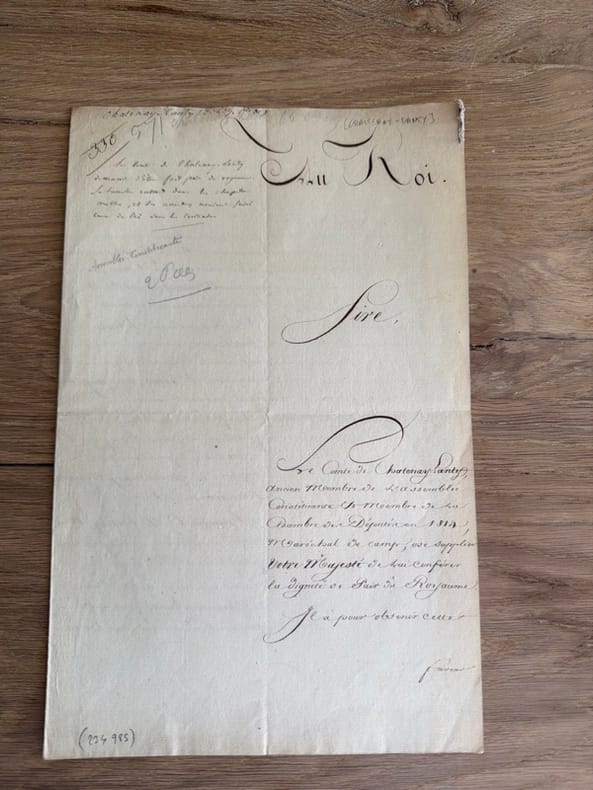 Adressée à Louis XVIII tout juste revenu de Gand, cette supplique désintéressée respire l'amour du bien commun : "Le Comte de Chastenay-Lanty, ancien membre de l'Assemblée constituante et membre de la Chambre des députés en 1814, maréchal de camp, ose supplier Votre Majesté de lui conférer la dignité de Pair du Royaume". Et les raisons ne manquent pas pour cette nomination, toutes inspirées par l'excellence des qualités personnelles de l'impétrant : "Il a pour obtenir cette faveur, tous les titres que peut donner la naissance ; peu de familles anciennes à présent existantes en France, peuvent en produire d'aussi honorables et d'aussi constans que les siens. L'un de ses pères, Jéhan de Chastenay est nommé au nombre des seigneurs & chevaliers qui ont accompagné St Louis, votre auguste ayeul, dans ses croisades".On ne comprend vraiment pas pourquoi le monarque, instruit de si lumineuses qualités, n'a jamais élevé le comte de Chastenay-Lanty (1748-1830) au rang désiré. Mais qu'on se rassure, son fils Henri-Louis (1772-1834) entrera dans l'auguste assemblée ... sous Louis-Philippe. - - VENTE PAR CORRESPONDANCE UNIQUEMENT - LIEN DE PAIEMENT, NOUS CONSULTER.