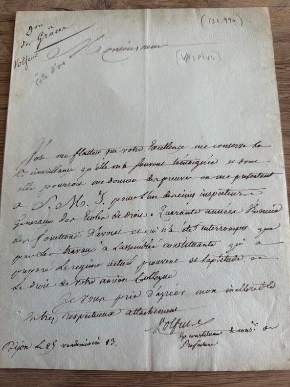 Pateline demande de recommandation pour un poste, présentée au nom de souvenirs communs (mais on ignore l'identité précise du destinataire) : "J'ose me flatter que Votre Excellence me conserve la bienveillance qu'elle ma souvent témoignée et dont elle pourroit me donner des preuves en me présentant à S.M.I. pour l'un des inspecteurs généraux des écoles de droit". Suit une brève énumération des titres de l'impétrant à cette fonction : il faut dire que l'avocat Alexandre Volfius (1743-1805), fils d'un procureur au Parlement de Dijon, en plus d'une longue pratique, avait été député du Tiers État aux États généraux de 1789. Il dut cependant se contenter de son modeste poste de conseiller à la préfecture de la Côte-d'Or (1802 à sa mort). - - VENTE PAR CORRESPONDANCE UNIQUEMENT - LIEN DE PAIEMENT, NOUS CONSULTER.