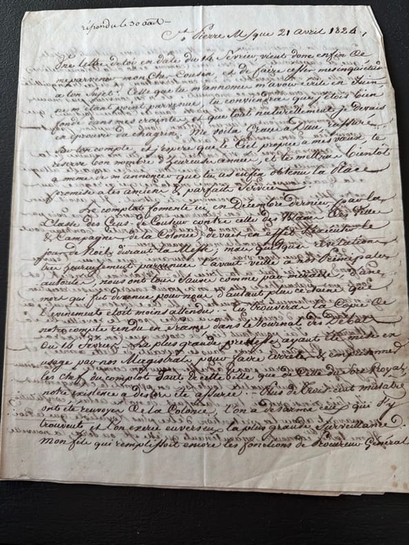 Petit ensemble qui regroupe trois missives de Pierre-François-Xavier de Lucy de Fossarieu (1755-1829), ancien militaire, à un cousin (non identifié, mais qui a 73 ans en 1827), résidant manifestement en France étant donnée la durée de transport des lettres (celle du 5 mars 1825 répond à un envoi du 28 juillet 1824, parvenu seulement le 10 février à Saint-Pierre).1. Du 21 avril 1824. Donne de très intéressants détails sur la perception, par les colons blancs, de l'Affaire Bissette, qui se limitait en fait à la diffusion, en décembre 1823, d'un opuscule manuscrit intitulé De la Situation des gens de couleur libres aux Antilles Françaises, et qui se transforma dans l'opinion des colons en projet de massacre généralisé des Blancs : "Le complot fomenté ici, en décembre dernier, par la classe des gens de couleur contre celle des blancs des villes & campagnes de la colonie, devait en effet s'exécuter le jour de Noël durant la messe ; mais quelques révélations très heureusement parvenues l'avant-veille à nos principales autorités, nous ont tous sauvés, comme par miracle, d'une mort qui fût devenue pour nous d'autant plus certaine que l'événement était moins attendu". Xavier est le père de Richard de Lucy de Fossarieu (1790-1839), qui exerçait les fonctions de procureur général et se chargea de la poursuite des "comploteurs" et d'une répression disproportionnée. Fervent partisan des thèses racistes, c'est lui qui fit condamner en appel Cyrille Bissette à la marque des lettres GAL et aux galères perpétuelles. Son père semble dans le même état d'esprit, qui loue son "zèle" et sa "supériorité", et conclut fort naïvement : "Je n'en conviens pas moins avec toi (à raison de ce qui se passe dans les colonies voisines) que nous sommes toujours sur un volcan dont l'éruption peut avoir lieu d'un instant à l'autre".2. Du 5 mars 1825. Ne porte que sur des nouvelles familiales et l'acquittement d'une affaire.3. Du 20 novembre 1827. Considérations sur l'âge et la santé des deux cousins : Fossarieu a 72 ans et son cousin 73 ; ce dernier a passé son enfance à Saint-Pierre sur une habitation de colons. - - VENTE PAR CORRESPONDANCE UNIQUEMENT - LIEN DE PAIEMENT, NOUS CONSULTER.
