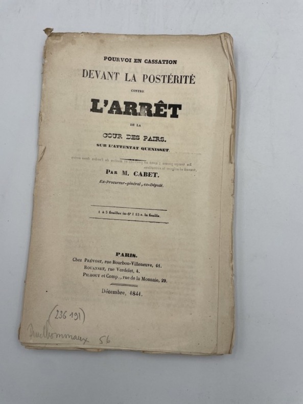 Définit les positions du Populaire dans l'Affaire Quenisset, affirmant qu'il n'y eut "ni complot ni complicité d'attentat" : en effet, le 13 septembre 1841, le duc d'Aumale accompagné de ses frères, les ducs d'Orléans et de Nemours, fit son entrée dans Paris à la tête du 17e léger dont il était colonel. Dans le faubourg Saint-Antoine, un coup de feu fut tiré par un nommé François Quenisset dit Papart, scieur de long de son état. Au cours des interrogatoires, il déclara appartenir à la Société des ouvriers égalitaires qui comportait trois sections : les égalitaires, les communistes et les réformistes. Il dénonça les personnes qui avaient participé au complot en affirmant qu’elles l’avaient trahi. La Cour des pairs fut, selon la Charte, chargée du jugement. Elle condamnera Quenisset et deux complices à la peine de mort, mais le roi commua la peine en bannissement à perpétuité ; trois complices à la déportation et six autres complices à des peines de cinq à quinze ans de détention. - - VENTE PAR CORRESPONDANCE UNIQUEMENT