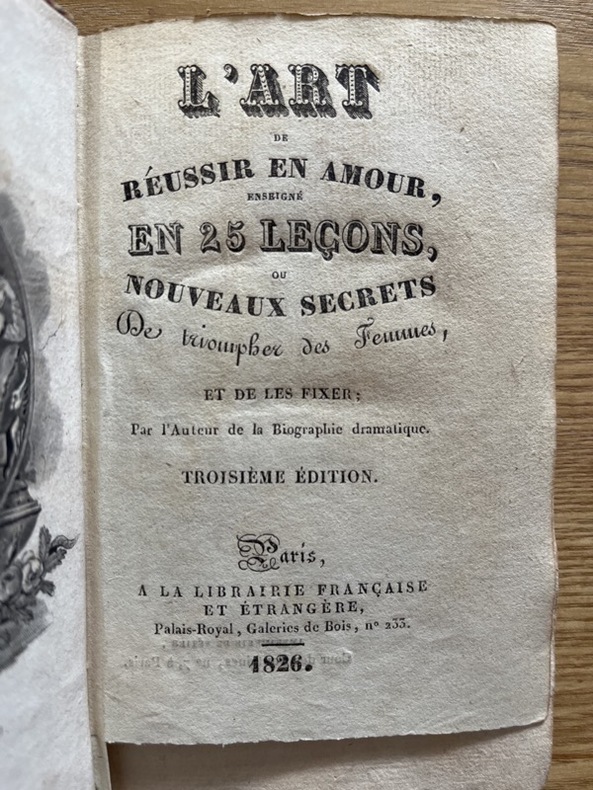 D'après Gay, cette édition serait un retirage de L'Art de réussir en amour ou les études du sentiment, en vingt-cinq leçons, paru en 1824 : "En changeant simplement le titre, on a simulé de ce bouquin, en 1825 et en 1826 une seconde et une troisième édition (...)".Gay et Vicaire attribuent cet ouvrage à Emile Marco de Saint-Hilaire.Gay, I, 287. Vicaire, VII, 19. - - VENTE PAR CORRESPONDANCE UNIQUEMENT - LIEN DE PAIEMENT, NOUS CONSULTER.
