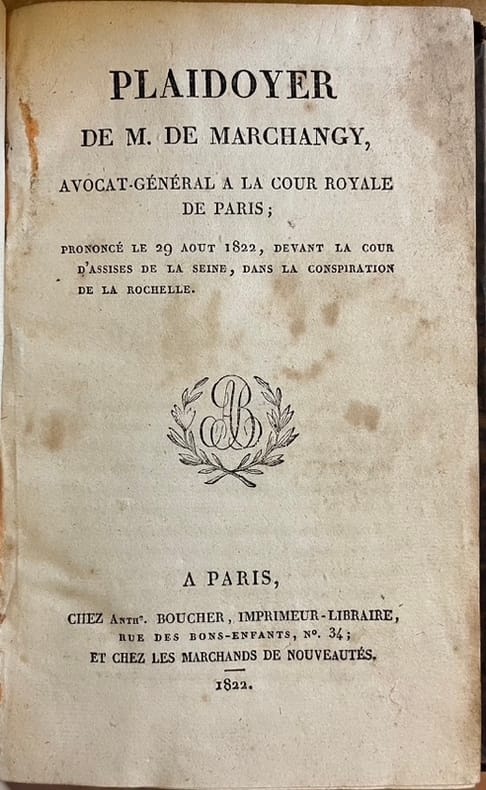 A Paris, Chez Anth. Boucher, et chez les Marchands de Nouveautés, 1822. 241, (1) pp. + booksellers catalogue (Boucher) of 8 pages. 8vo. Sewn in original blind wrappers. First edition. Marchangy was the government prosecutor at the trial of the four sergeants of La Rochelle. This prosecution was his most famous case: the four sergeants were executed for their part in a Carbonari plot to overthrow the government. The Carbonari or Charbonnerie, a secret revolutionary group opposed to the Bourbon Restoration government, most active from 1821 to 1823. It was started after conspirators who had fled to Italy and had been in contact with the orginal Italian Carbonari, returned to France to found their own Carbonari, in May 1821. The society grew rapidly, merged with another secret revolutionary group, the Knights of Liberty, and had perhaps 50,000 members within two years. The Carbonari were remarkably unsuccesful at revolution. The most famous uprising of this revolutionary group was that of four sergeants of La Rochelle. These unfortunate young soldiers, too open with their comrades about a planned uprising, were executed on 21 September 1822. They could probably have saved themselves by cooperating with the government in tracking down the carbonari leadership. Their silence earned them liberal sainthood: see: Historical Dictionary of France from the 1815 Restoration to the Second Empire, volume i, pp. 152-154. - Somewhat browned throughout, uncut.