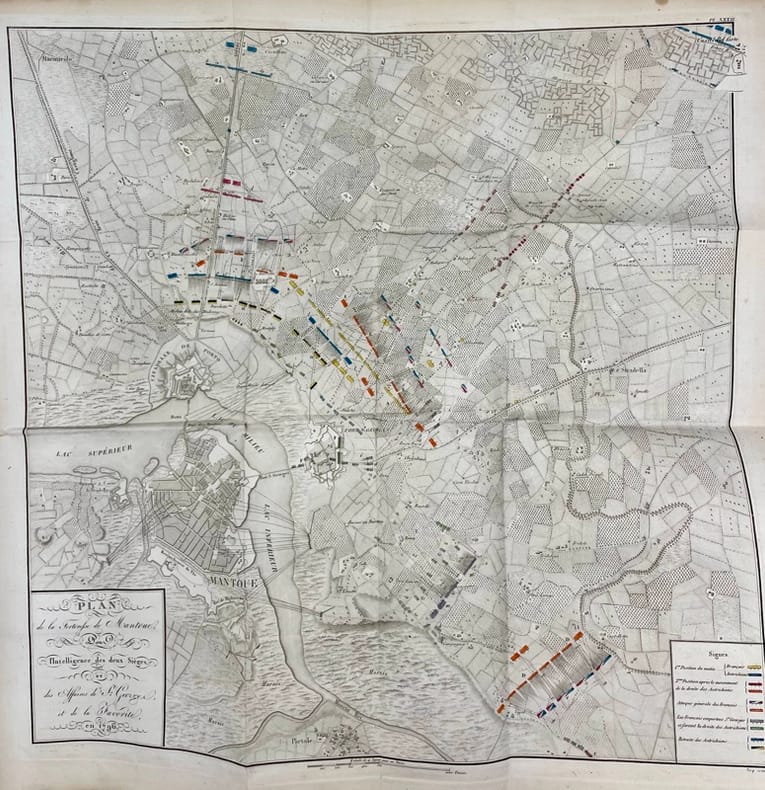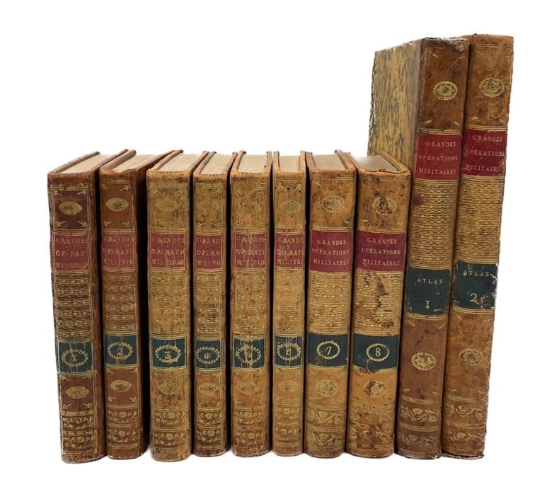 Exceptionnelle réunion des travaux de Jomini composée de la façon suivante :- Tomes 1 à 5 : Traité des grandes opérations militaires, contenant l'Histoire critique des campagnes de Frédéric II, comparées à celles de l'Empereur Napoléon.- Tomes 5 à 8 : Histoire critique et militaire des campagnes de la Révolution, comparées au système de l'Empereur Napoléon ; faisant suite au Traité des Grandes Opérations militaires.Les tomes 7 et 8 sont publiés en 1816 et se trouvent très rarement joints.- Atlas : 29 planches (certaines comportant plusieurs cartes), 24 pour le Traité des Grandes opérations militaires, 5 pour l'Histoire critique des campagnes de la Révolution.- Atlas : De la planche XXX à la planche XLI. Ces cartes sont uniquement consacrées aux campagnes d'Italie. "Instruit à l'école de la victoire, et à l'aide des faits extraordinaires dont il a été le témoin, le général Jomini a tout à la fois posé les bases du système stratégique et mis les véritables principes de la science des marches à la portée de tout le monde. C'est en un mot, l'exposition complète du système de guerre moderne qui a acquis dans l'Europe une juste célébrité, parce que les résultats comparés de la guerre de sept ans et des guerres de la Révolution y sont, pour la première fois, réduit en corps de doctrine. (...) Avec eux, on pourra aisément suivre, concevoir et juger les grandes opérations d'une campagne ; parce que chaque marche, chaque ligne d'opération, chaque mouvement stratégique, enfin le mécanisme des batailles et même l'ensemble d'une guerre entière, tout y est soumis à des principes généraux et fixes, ainsi qu'à une critique juste et sévère, mêlée de profonde réflexion." Catalogue d'éditeur Anselin et Pochard (successeur de Magimel).Jomini dominera la pensée militaire et stratégique tout au long du XIXe siècle devant Clausewitz.Bon exemplaire, en reliure uniforme. Ex-libris manuscrit (difficilement lisible) et ex-libris héraldique.De la plus grande rareté complet. Le second atlas consacré aux Campagnes d'Italie ne se rencontre pratiquement jamais. - - VENTE PAR CORRESPONDANCE UNIQUEMENT