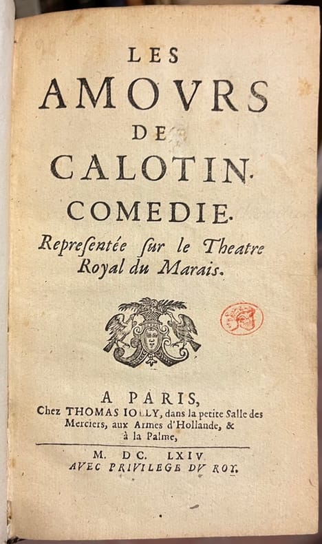 Édition originale rare.Les gens de théâtre vivent de jalousies plus ou moins rentrées et le principal intérêt de la pièce réside dans les tirades du premier acte où il est question de la célébrité de Molière et de sa troupe, comme dans cette déclamation du baron : "Hors Molière, pour vous il n'est point de salut, / Tous les autres autheurs vous sont insupportables, / Les Corneilles auprès sont autheurs détestables, / Ce qu'ils mettent au jour est par trop sérieux, / Et bien loin de vous plaie, ils vous sont ennuyeux." Exemplaire de l'historien du XVIIe siècle et du théâtre Georges Mongrédien (1901-1980), avec vignette ex-libris contrecollée sur les premières gardes. - - VENTE PAR CORRESPONDANCE UNIQUEMENT